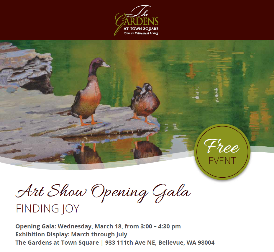The Gardens at Town Square 933 111th Ave NE, Bellevue, WAMake room for more art and enjoyment in your day. Join us for an invitational exhibition featuring work from Seattle-area artists who have been regular contributors to the Era Living Arts Exhibitions Program. This juried exhibition showcases a broad range of mediums and subject matter reflecting our precious world around us. Guests will enjoy complimentaryMore