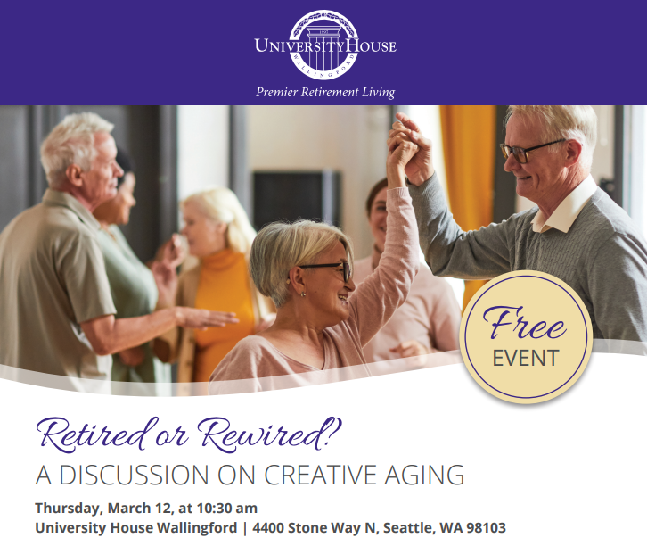 University House Wallingford 4400 Stone Way North, Seattle, WAResearch shows people who have a purpose, who contribute, and are socially engaged live longer and are happier. What will you do when you no longer work for pay? How will you contribute? What will you learn? Who will you teach? You’ll have plenty of time to “lie on the beach!” Join us for whatMore